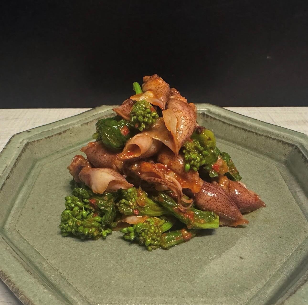 ほたるいかの旨みと香り、菜の花の苦味をお酢とコチュジャンベースのヤンニョムで和えました。